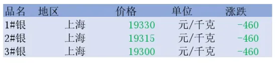 今日白银市场同步迎来大幅回调,现货各规格价格统一大幅下调。上海现货市场报价显示,1# 白银报 19330 元 / 千克、2# 白银报 19315 元 / 千克、3# 白银报 19300 元 / 千克,三大主流规格单日统一下跌 460 元 / 千克,跌幅显著。