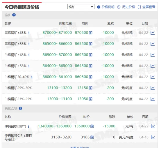 2026 年 4 月 22 日(周三),国内有色金属市场整体呈现普跌格局,贵金属、工业金属多数走弱,小金属板块弱势加剧。其中钨系品种再度破位大跌,主流品位钨精矿失守 87 万元 / 标吨关口,锡价结束连日上涨高位回调,仅铝价小幅止跌反弹,钽、铌维持平稳运行。