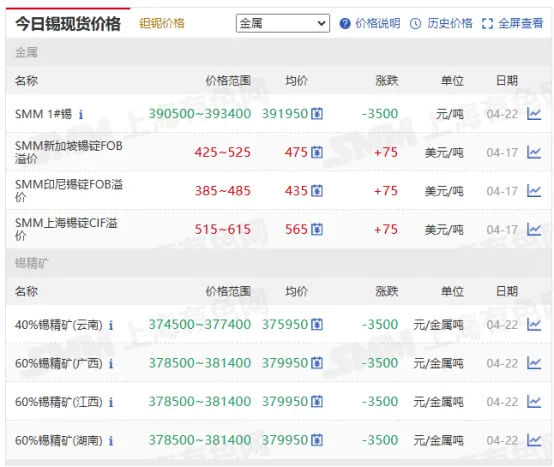 今日锡市场结束前期连续大涨行情,迎来高位大幅回调,现货与上游矿价同步下行。上海有色网数据显示,SMM 1# 电解锡现货报价 390500-393400 元 / 吨,均价391950 元 / 吨,单日下跌 3500 元 / 吨;上游锡精矿同步跟跌,云南 40% 锡精矿、广西 / 江西 / 湖南 60% 锡精矿均价全线下调 3500 元 / 金属吨,跌幅与现货完全同步。