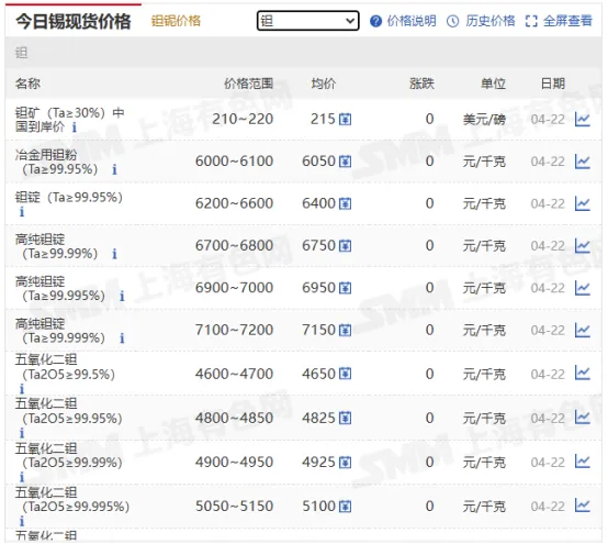 今日钽系金属全线止跌持稳,全品类报价与昨日完全持平,无任何涨跌波动,低位横盘格局进一步巩固。精准实盘报价:钽矿(Ta≥30%)中国到岸价 210-220 美元 / 磅,均价215 美元 / 磅,日内持平;冶金用钽粉均价 6050 元 / 千克,持平;钽锭(Ta≥99.95%)报价 6200-6600 元 / 千克,均价6400 元 / 千克,持平;各纯度高纯钽锭、五氧化二钽全系列报价均保持不变。