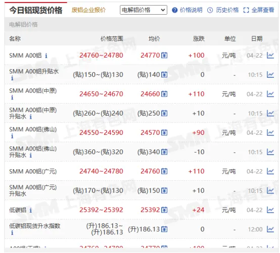 今日国内电解铝市场结束连续两日的大幅回调,迎来小幅止跌反弹,各地区现货价格同步回升。SMM A00 电解铝主流报价 24760-24780 元 / 吨,均价24770 元 / 吨,单日上涨 100 元 / 吨;中原、佛山、广元等地区铝价同步回升,涨幅集中在 90-110 元 / 吨,现货升贴水维持贴水状态,整体波动幅度有限。
