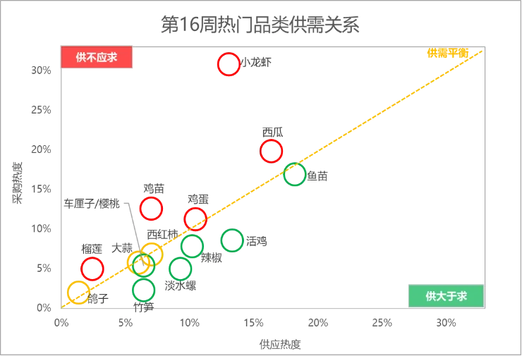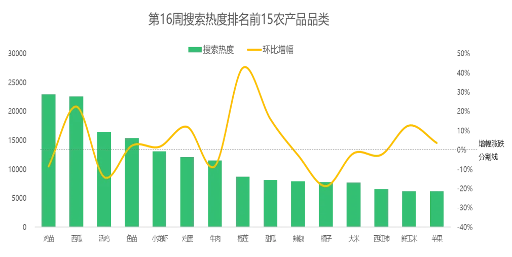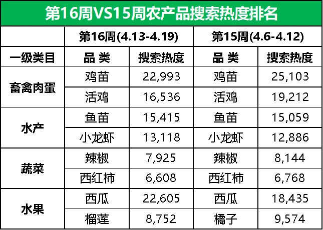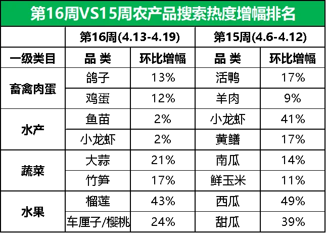 榴莲走俏市场,竹笋行情逆势上涨,小龙虾和樱桃价格呈跌势第16周,惠农网平台搜索热度排名前15的农产品主要分布在水果(5)、畜禽肉蛋(4)、蔬菜(3)、水产(2)和粮油米面(1)等5个大类,相较于第15周,水果和蔬菜下的品类数量均增加1个,畜禽肉蛋和粮油米面下的品类数量均减少1个。从环比增幅来看,第16周排名前15的农产品品类的市场关注度涨跌基本持平。西瓜、鱼苗、小龙虾、鸡蛋和榴莲等8个品类的搜索热度实现增长,鸡苗、活鸡、牛肉、辣椒和橘子等7个品类的搜索热度有所下滑。具体细分到品类,榴莲涨势尤为强劲,市场关注度较上周大涨43%;而橘子的市场关注度下滑较快,环比跌幅为19%。从排名来看,榴莲和鲜玉米的排名分别前移8位和6位至第8名和第14名,甜瓜和苹果的排名均前移2位至第9名和第15名,西瓜和鸡蛋的排名均前移1位至第2名和第6名;橘子和大米的排名分别后移3位和2位至第11名和第12名,活鸡、牛肉、辣椒和西红柿的排名均后移1位至第3名、第7名、第10名和第13名;鸡苗、鱼苗和小龙虾的排名与上周保持一致。据惠农网平台对畜禽肉蛋、水产、蔬菜和水果4大农产品类目的重点监测与追踪,第16周,畜禽肉蛋、水产和蔬菜排名前2位的品类与上周保持一致,仅水果的排名有所调整:西瓜蝉联榜单首位,榴莲市场表现十分出色,搜索热度迅速攀升至第2名。2.2 市场潜力搜索品类