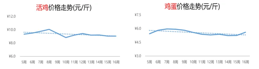 市场热门搜索品类的热度增幅方面,第16周,榴莲“人气”大涨,搜索热度较上周增长43%,车厘子/樱桃和大蒜依次随后,搜索热度环比增幅分别为24%和21%。分大类来看,畜禽肉蛋方面,鸽子跃居冠军位,鸡蛋紧跟;水产方面,鱼苗和小龙虾齐头并进,分列第1、2位;蔬菜方面,大蒜成市场“主角”,竹笋的搜索热度环比增幅同样亮眼;水果方面,榴莲一举夺魁,车厘子/樱桃次之。分析惠农网平台热门品类的供需关系:西瓜、鸡蛋、鸡苗、小龙虾和榴莲的供应相对偏紧;西红柿、大蒜和鸽子的供需相对稳定;辣椒、活鸡、竹笋和鱼苗等6个品类的供应相对充足。4.1 禽畜肉蛋:活鸡价格窄幅调整,鸡蛋行情加速上涨