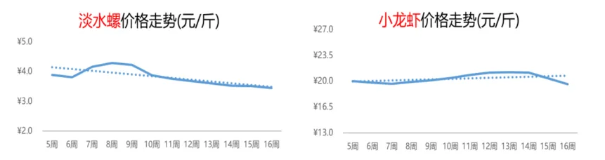 不难看出,近几个月活鸡的行情整体呈现“先明显波动,后窄幅调整”的走势。第16周,活鸡的价格为9.1元/斤,环比基本持平,同比上涨2%。随着五一假期的临近,商超、餐饮以及食品加工企业均进入集中备货阶段,对鸡蛋的采购量显著上升,推动行情上涨加快。本周,鸡蛋的价格为5.6元/斤,较前一周上涨0.4元/斤,涨幅为7%,但同比跌幅为11%。4.2水产:淡水螺价格连周下滑,小龙虾行情跌势再延
