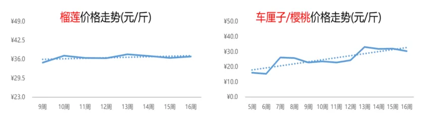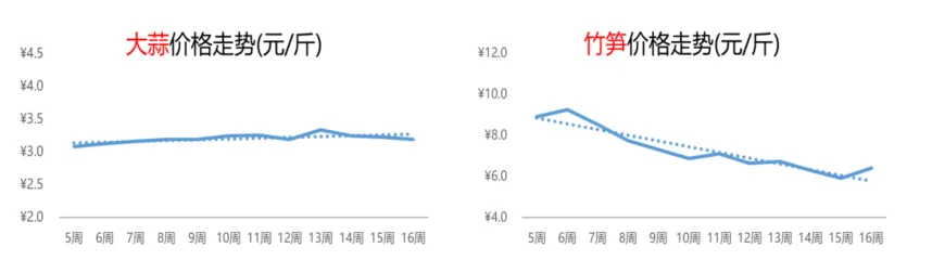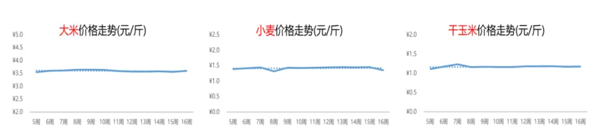 因市场供应较为充足,整体需求一般,淡水螺的价格自3月以来便一路下跌,当前已经跌至近期低点3.4元/斤,相比上周下跌2%,相比去年同期却上涨4%。受气温升高的影响,小龙虾的生长速度加快,上市量稳步攀升,价格延续下行。第16周,小龙虾的价格为19.6元/斤,环比和同比均出现下滑,跌幅分别为4%和14%。从供需基本面来看,大蒜的供应和需求总体均衡、市场平稳运行,价格暂未出现大起大落。本周,大蒜的价格为3.2元/斤,较上周和去年第16周分别下跌1%和11%。前段时间,竹笋大量上市,再加上春菜供应整体增多,价格一跌再跌,但是本周,竹笋的行情出现反弹,周均价上涨8%至6.4元/斤,但同比下滑2%。榴莲市场热度快速攀涨,采购旺盛,价格轻微上行。第16周,榴莲的价格为37.0元/斤,环比上涨1%,但同比下跌16%。国产樱桃上市初期,数量较少、品质优,价格通常维持在高位,但随着供应的逐步增加,樱桃价格从第13周的33.1元/斤下滑至本周的30.5元/斤,跌幅为8%;与去年同期相比,今年樱桃的行情要偏低一些,跌幅达18%。4.5 粮食:大米价格小涨,小麦行情回撤,干玉米价格平稳