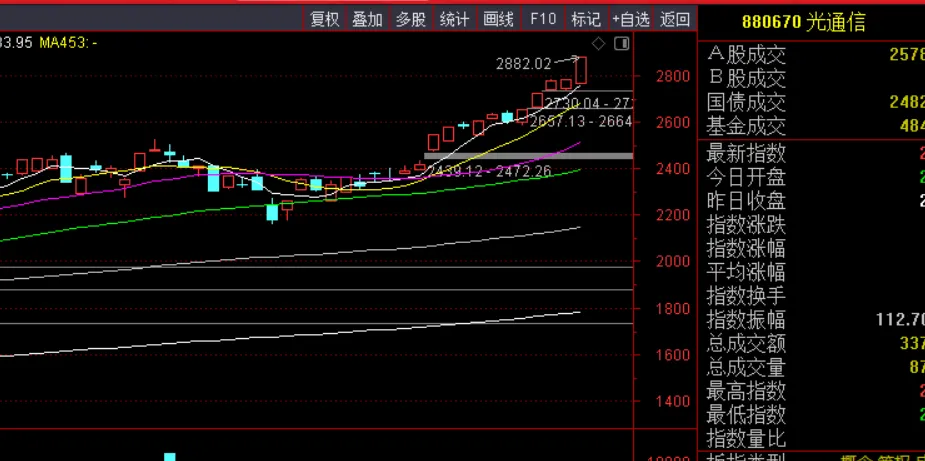 今天,指数延续强势特征,午后,沪指发力站上4100关口,领先的创业板再次拉出1.73%的阳线,日线已是5连阳,两市成交量2.57万亿,较昨天放量1522亿。如果只看这些数字,你会觉得牛市的鼓点越敲越响。但军师今天要说一些不一样的看法,因为在这张看似完美的盘面背后,我感觉到了一丝不安。