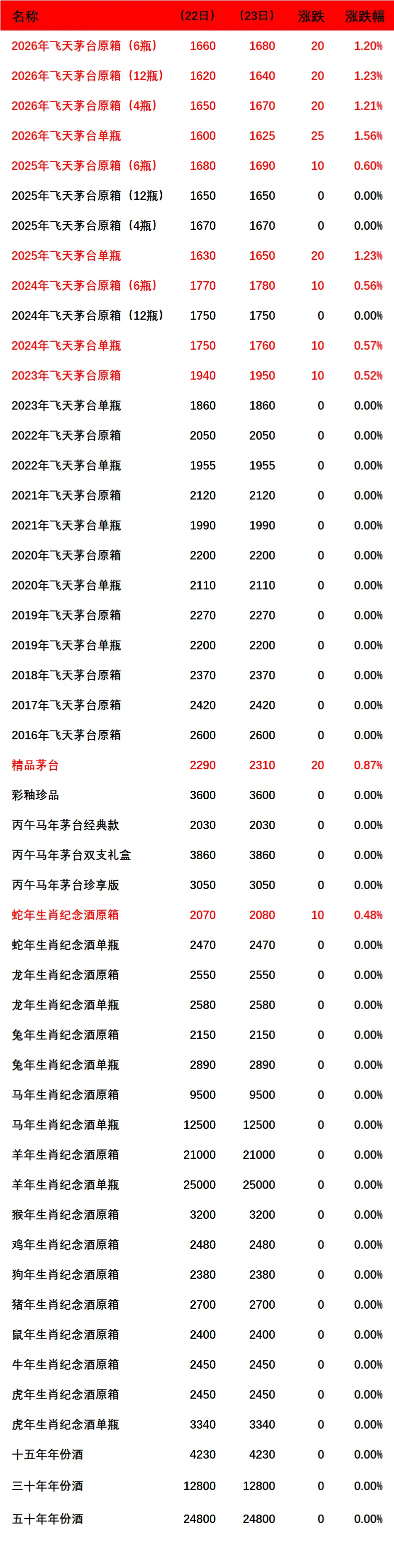 2023年飞天茅台原箱,2024年飞天茅台原箱(6瓶)和单瓶,2025年飞天茅台原箱(6瓶)和单瓶,2026年飞天茅台原箱(6瓶、12瓶、4瓶)和单瓶,精品茅台和生肖蛇年原箱上涨;