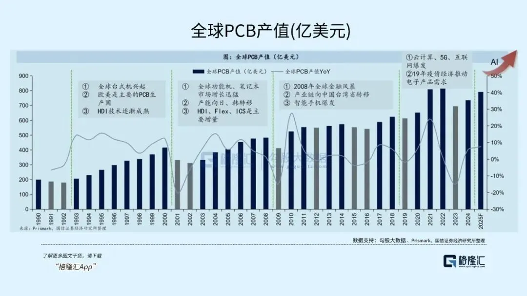 在下游应用领域,PC、手机、通信等行业的创新迭代直接拉动PCB需求。从90年代的台式机、00年代的笔记本,到2010年前后的智能手机,再到2020年以来的5G基站大规模建设,每一轮电子产品的升级都推动了PCB行业的阶段性成长。