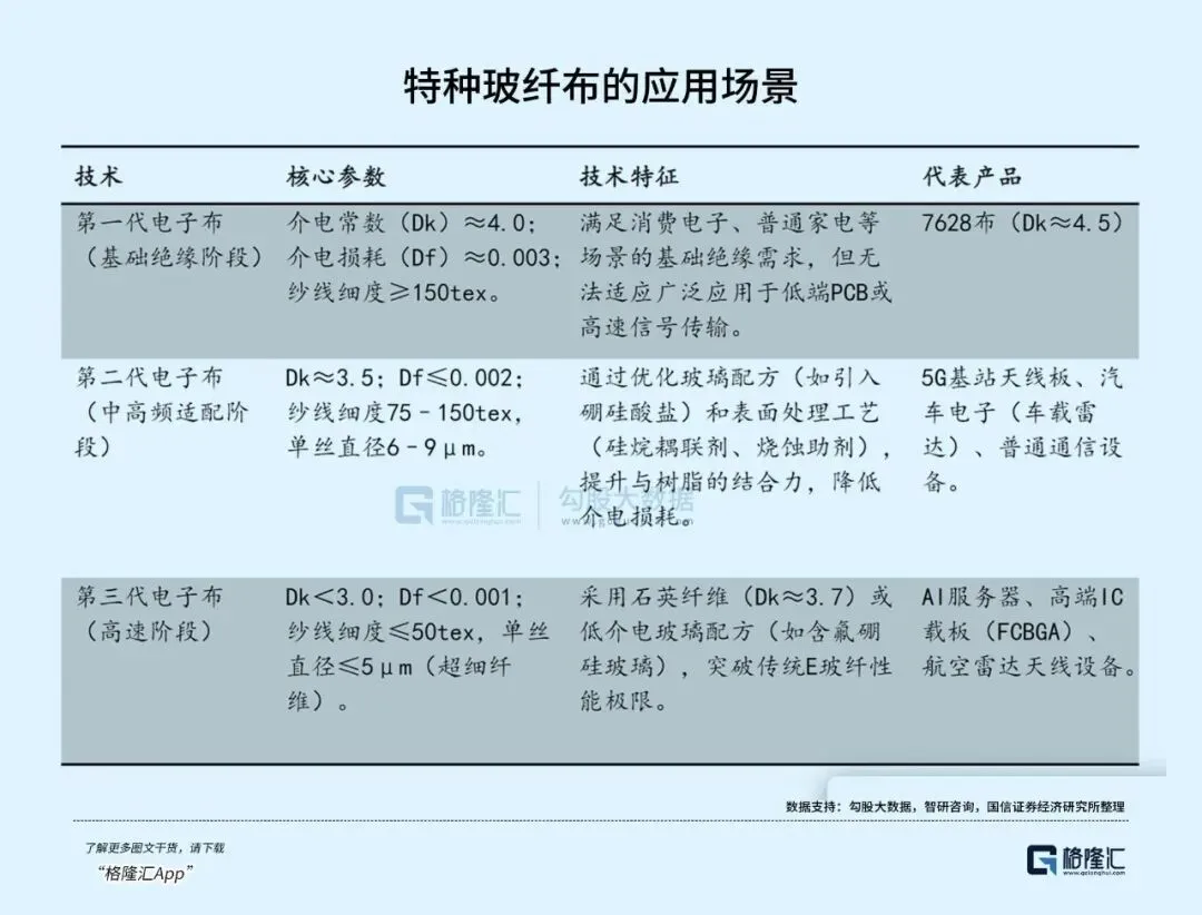 低介电电子布作为一种具有低介电常数(Low-Dk)和低介电损耗(Low-Df)的玻纤布,能有效减少信号传输衰减与失真,提升传输速度和质量,随着5G、AI技术的发展,其应用占比正快速提升。
