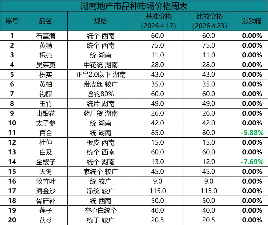 2026年4月17日-2026年4月23日期间,20个湖南地产中药材品种,其中0个品种价格上涨,占比0%;2个品种下跌,占比10%;走平品种18个,占比90%。