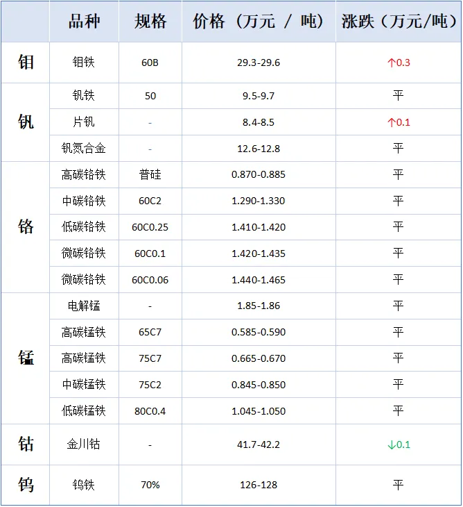 今日导读:钼价大涨,钒价持平,钴价小幅下调,锰价窄幅盘整,铬价持稳运行,钨价弱势暂平。
