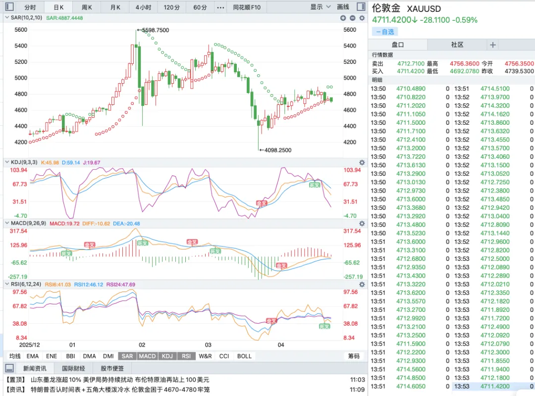 先同步今日实时行情:黄金开盘4740美元/盎司附近,开盘下行触及日内低位4695美元/盎司后企稳反弹,最高触及日内高位4753美元/盎司,目前在4705美元/盎司附近震荡,等待短线方向选择。