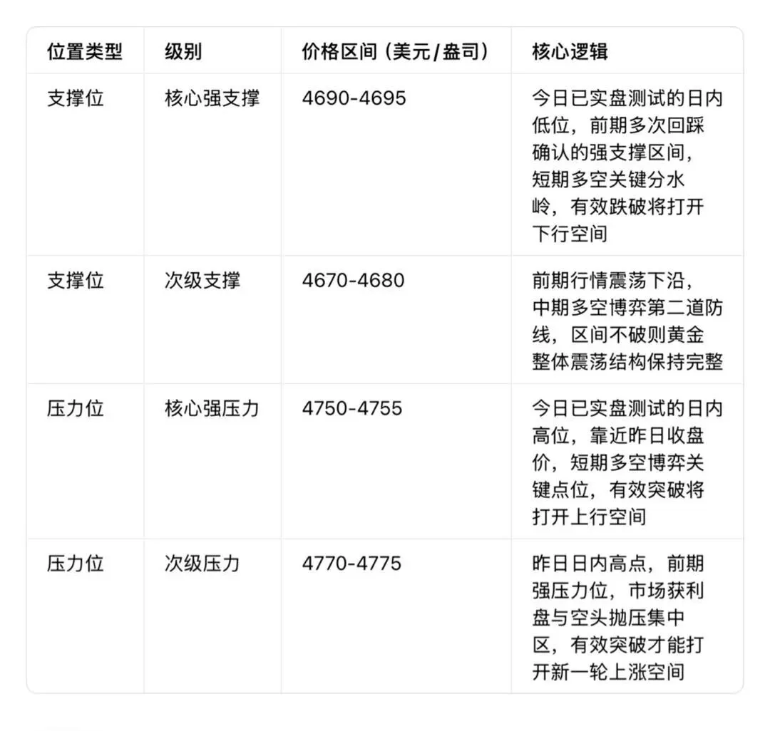 1. 核心强支撑:4690-4695美元/盎司:今日实盘测试有效,不破则看企稳反弹,有效跌破将打开下行空间