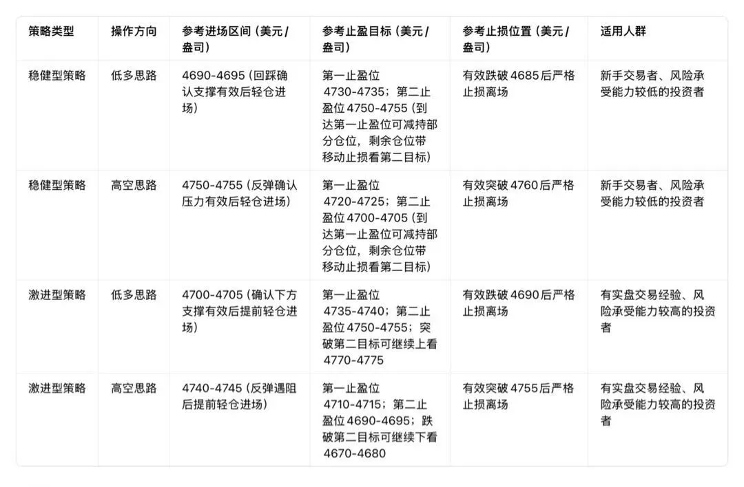 1. 低多思路:4700-4705区间确认支撑有效后提前轻仓进场,止盈看4735-4740、4750-4755,突破可上看4770-4775,有效跌破4690严格止损离场