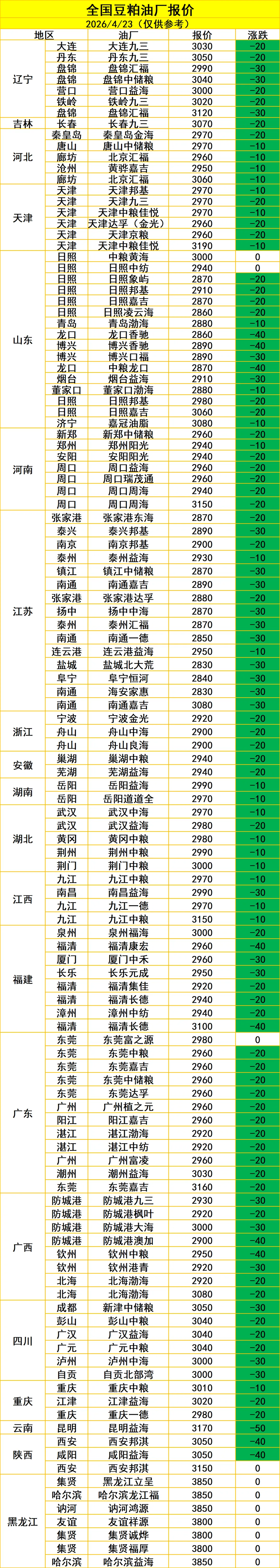4月23日,沿海地区43%蛋白豆粕现货价格2890~3090元/吨,较前一日小幅上涨10~50元/吨。期货方面,豆粕主连收涨至3026元/吨,主要受美豆油创新高及美豆播种受阻提振。