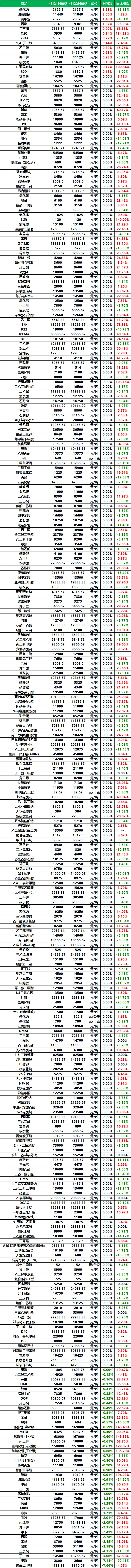 2026年4月22日大宗商品价格涨跌榜中化工板块环比上升的商品共14种,涨幅前3的商品分别为硫化钠(3.53%)、四氢呋喃(3.50%)、二氯甲烷(1.48%)。