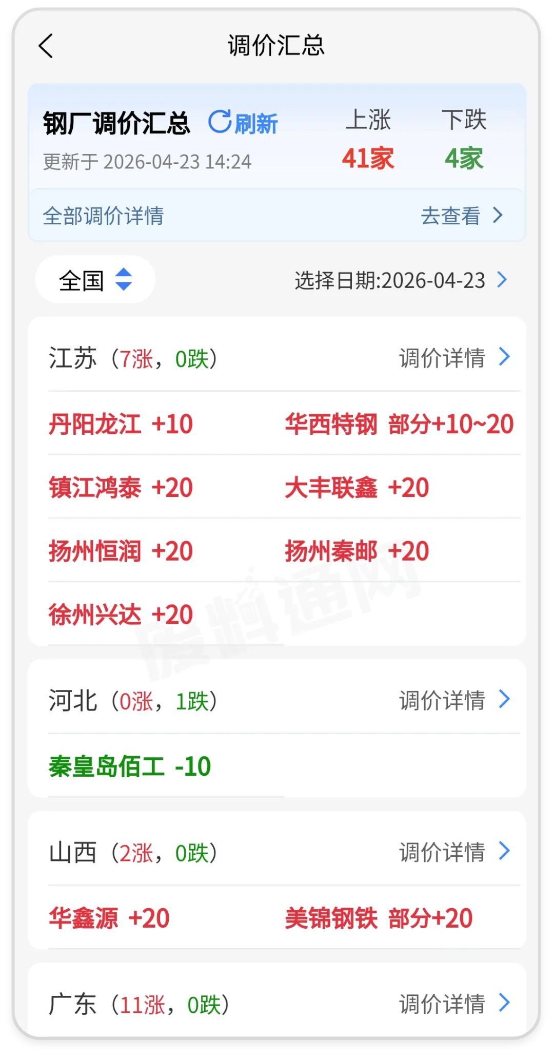 4月23日江苏【丹阳龙江】废钢最新价涨10:钢筋切粒2330,钢板料、模具钢2330,优重2300,重废2280,机械生铁2230,冲子2270,中废2190,钢筋头2270,钢刨花2100,不含税4月23日江苏【镇江鸿泰】涨20,最新价:新钢筋头:2310,新钢板料:2340,重废1:2310,重废2:2270,中废:2210,剪料1:2140,剪料2:1940,冷热轧冲子:2240,镀锌冲子:2210,冷热轧冲皮:2170,镀锌冲皮:2140,冲皮统料:2040,矽钢片:2200级破碎料:2250,二级破碎料:2150,钢刨花:2050,数控刨花:2000,普通刨花:1950,轻钢龙骨/钢丝绳:1900,废钢统料:1730,不含税4月23日江苏【徐州兴达】最新价涨20:精炉料停收,冷板压块2370,刨花压块2120,钢刨花2160,普刨花2120,镀锌冲子2240,低锰冲子冲片2280-2320。不含税4月23日8:00起,河北【秦皇岛佰工】钢铁所有料型下调10元/吨。最新价格:切头一级2440元/吨,矽钢片2230元/吨,废钢重A2390元/吨,废钢重B2320元/吨,刨花2070元/吨,一级冲件2280元/吨,螺纹钢筋切头2440元/吨,一级冲豆2420元/吨,二级冲豆2390元/吨,钢板料A2440元/吨,钢板料B2390元/吨,碎花铁2440元/吨,一级剪切料2230元/吨,二级剪切料2160元/吨,特级破碎料2330元/吨,特一级破碎料2260元/吨,一级破碎料2250元/吨。不含税4月23日山西【美锦钢厂】废钢采购价部分涨20:特级钢筋颗粒2350,特级钢筋段2270,特级冲豆料2350,特级≥20mm重废2320,特级>14mm重废2290,特级≥10mm重废2230,一级>8mm重废2200,二级≥6mm重废2160,三级≤5mm重废1820,不含税4月23日广东【敬业揭阳基地】最新价涨18:钢筋压块2447,钢筋头2450,中型1类2480,重型3类2480,中型2类2450。不含税4月23日广东【江门宝丰】废钢涨20:模具钢特优2340,钢筋头边角料2340,优重2320,乱钢筋2250/2300,重废2290,船板料2190-2220,生铁,硬钢2290,冷轧冲子2260-2290,冷轧压,热轧压2260-2290,厚剪2250,小剪2090-2150,一级钢屑2170,角铁2040-2130,统料1860-1960,彩瓦1730-1830,破碎料1900-2130,弹簧床压块1930,钢丝绳1650-1750,不含税4月23日广西【梧州永达】涨20:钢筋压块:2300,一级纯压:2300,二级压块:2270,热板碎料:2270,高碳钢:2320,重型废钢2320,一级剪料:2290,二级剪料:2240,不含税4月23日安徽【郎溪鸿泰】涨20。重废一:2280,重废二:2250,机生铁:2240,中废一:2200,中废二:2140,剪料:2010,未达标准的一律退货。生铁80公分以内,重废80公分以内。密封件重罚,掺假罚款3-10万。价格以到厂验货为准。 免费看全国钢厂调价汇总👇点图片