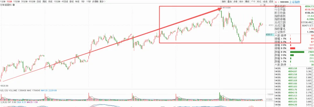 技术面:今天上证指数收阴线,很小的阴线却出现了很大范围的调整,从技术面看, 今天高开然后创新高,随后回补普通缺口之后出现低点,所以,从早盘开始我们的操作也很简单,把盈利盘逐渐进行减仓。原因很简单,1.这波底部反弹,不论是赚钱的,还是不赚钱的,都不想卖,所以,成交量放不出来,也就意味着大资金在这个位置的洗盘和吸收是不够的。2.从大级别看,目前是一个日线级别的震荡走势,既然日线级别走的是震荡,那么整体的趋势依然是属于防守为主的姿态,这波反弹连续突破,甚至突破4197的可能性是很低的。3.目前连续几天,热点割裂,内部分化,赚钱效应其实不好,今天甚至开始拉白酒。那么我们就可以感觉得出来,市场其实是有些滞涨的,虽然技术头型非常好,今天依然是踩住了5日线。所以我们要从内部小结构分析,我们从5分钟结构,早盘时候我就已经讲的很清楚,中5分钟级别的回调已经开始,直到收盘,大5分钟30分钟级别也进入的震荡,所以这个时候,我们不要去赌她突破突破,我们短线和波段做一些止盈是没有任何问题的。目前4052和4002是震荡和回调的主要支撑为主,我也认为,一旦出现震荡洗盘,那么50-100个点的震荡幅度还是需要的。那么我们也要注意自己的个股,盈利偏离值大的,适当止盈,波段股做好高抛低吸的工作,目前可以不要执着t+0