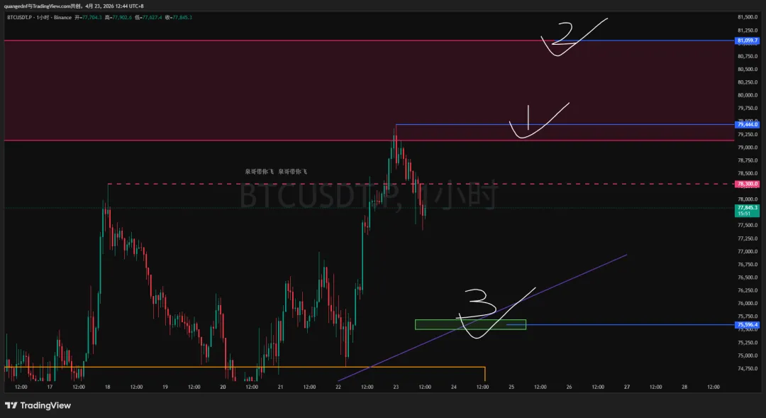 BTC 来到79444受阻下跌,目前跌破回之前高点下方,但是现在距离阻力位置有一段距离了,我会留意二次测试阻力 79444的位置再找做空机会或者下去做多。。