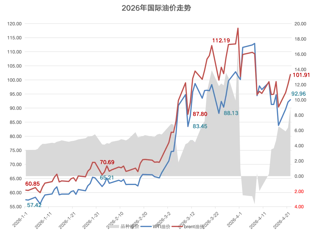美国宣布延长对伊朗临时停火,未设定明确结束时间;同时美军继续维持霍尔木兹海峡海上封锁,波斯湾战备状态保持不变。国际油价盘中震荡、涨跌互现。截止至4月23日15:00,WTI原油报96.69美元/桶、BRENT报97.93美元/桶、SC原油641.7元/桶。