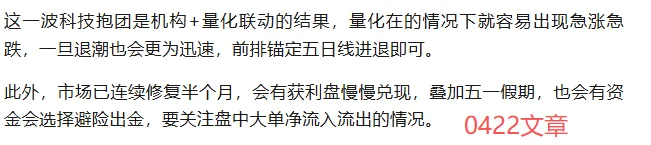 从上证来看,市场中期趋势还没变,科技有流出的资金也会寻找新载体,新周期的开启要等四月底各种影响因子出清之后了。