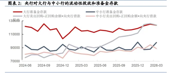 尽管超储率整体略低于预期,且央行货币政策工具从中小行回笼幅度更大,但中小行超储环比反而上升约万亿,大行超储环比下降约1600亿,相对应中小行存款环比升幅也高于大行。但是中小行资产端信贷、债券、股权与其他投资增速均出现回落,合计降幅高于大行,反映中小行存款并非来自于自身负债扩张,而是大行的存款转移。在此过程中,超储也相应增加,抵消了央行对中小行回笼资金更多的影响。与此同时,中小行也相应的增加融出、减少融入,净融出在3月跨季前后一度创下了近4年的新高。而中小行非银存款反季节性上升,可能反映了中小行在季末推动资金回表的动力不强,非银负债也相对稳定。