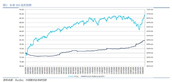 美股与美债近期的分化态势难以长时间维持,未来大概率将走向收敛。若后续油价进一步回落带动通胀预期回落,美债将迎来修复;而从美股自身来看,在前期快速上涨后估值面临透支,盈利预期虽有支撑但进一步上修空间有限,上行动能有限。反方向看,若油价上涨导致通胀失控迫使市场再度开启加息定价,高估值的美股将再次承压,并与美债共同走弱。因此,当前的分化走势后续大概率将有所收敛。