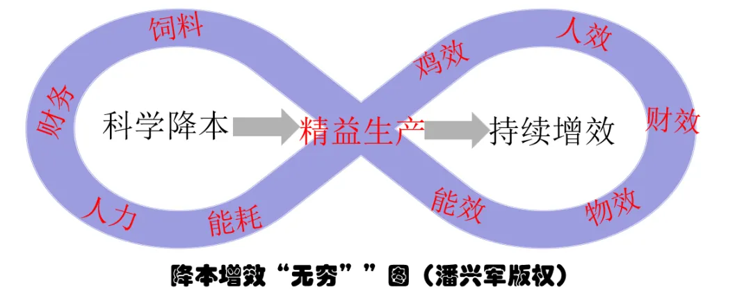 降本增效“无穷“”图是以“科学降本—精益生产—持续增效”为逻辑主线,将饲料、财务、人力、能耗、鸡效、人效、财效、物效、能效九大要素串联成一个循环往复(PDCA)的闭环系统。