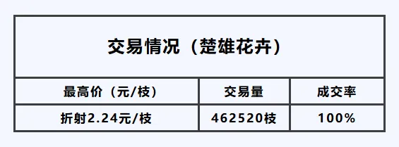 23日,楚雄花拍中心全渠道交易总量约为669440枝,今日交易量较前一交易日增加,总体购买力小幅上涨。成交率小幅下跌,交易情况如下: