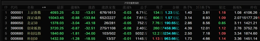 A股三大指数今日集体回调,截止收盘,沪指跌0.32%,收报4093.25点;深证成指跌0.88%,收报15043.45点;创业板指跌0.87%,收报3720.25点。沪深京三市成交额达到2.82万亿,较昨日放量2445亿。