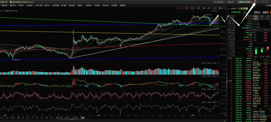 来看大盘的走势吧,现在的上证指数看起来依然还是没有出现所谓的二波回调走势,但这不代表后边不会回调,我们今天用一个相对煎熬的方式给大家呈现未来可能出现的指数波动,如图所示,只要指数继续上攻,量能不再放大的话,随时就会短期见顶,这时候美伊但凡来一点不确定性,那就真要回撤了,但是因为大A对战争暂时免疫,所以,往下也不会跌太多,缺口附近已经是比较合理的支撑区间,但如果跌太快的话,很就能看到反弹,然后再下来做二次探底,这样才有机会把日线的MACD指标“赶”到零轴上的位置做成死叉后再做金叉,这样就可以结束调整了,其实也不难,难的是必须有天时地利人和去配合这一切的走势,而美伊和谈就是那个钥匙,到底最终是不是给全世界一个标准答案,我们拭目以待,因为霍尔木兹海峡的长期开放才是经济企稳的重要前提,没有石油的话,大家都要去喝西北风了。