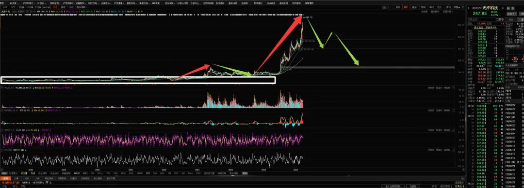 今天市场领跌的板块基本上还是以前期涨势不错的金属为主,说白了就是涨到头了,那就该慢慢走下行通道了,这也是黄金本身就该有的属性,谁也不会认为黄金的行情成为疯牛,该结束了;那么,今天我们还是来探讨CPO这个最有代表性的指标板块,今天这个板块里的中际旭创市值突破1万亿,这是非常疯狂的时候,这和当初茅台突破2万多亿市值的时候很相似,都是遍地红眼病,以及各种最终没忍住开始追买的散户,CPO板块就是这样,一开始大家是不上车的,也看不懂,现在涨太多了,看懂了,至少股价上认可价值了,可几乎已经到了最高点区域了,所以主力就开始掩护式出货了。虽然“易中天”现在没有大跌,但是同板块的其他龙头可没闲着,看看这个,光库科技,今天的K线已经算是非常难看了,如此高位的趋势合,带着量,带着顶背离往下杀出中阴线,这不就是典型的主力出货嘛!所以,我认为CPO板块已经开始出现风险苗头了,只要这个板块崩掉,高位抱团的资金就会不断撤出,而底部的个股就会因此开始出现“雨后春笋”般的走势,比如银行股,今天就是很好的例证。