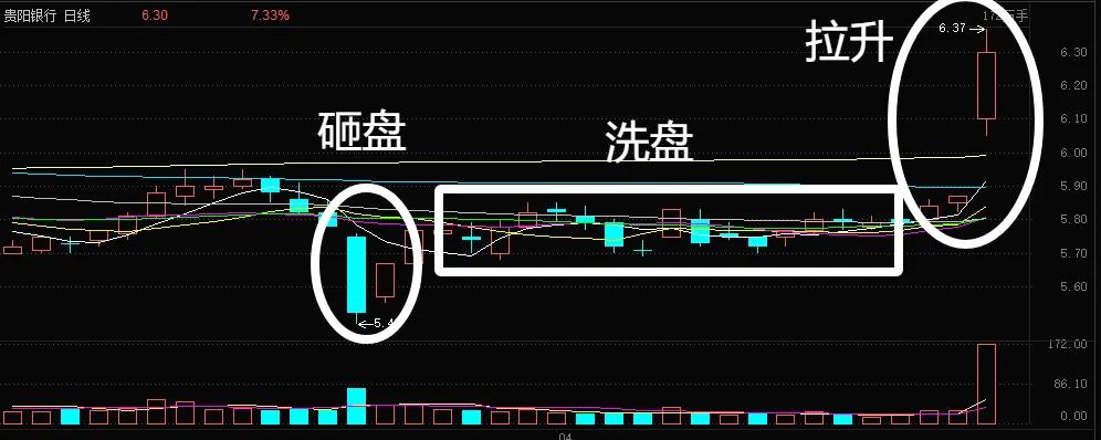 来看我们名单里的很低调的银行股,贵阳银行,其实你说它业绩有多好,也不算特别亮眼,只是年报和一季报都微幅增长,甚至不如我们更看好的西安银行,但因为它的洗盘过程更标准,更贴近教科书的答案,所以今天最早开始拉出这根大量的大阳线。如图所示,我把主力的这几个动作都标注出来了,可以看得出来,这一路的走势其实都是带着明显的骗筹目的的,一开始的时候,借助战争利空,大阴线大盘,逼出恐慌盘,带量,说明散户割肉了,然后并不着急上涨,而是一直横盘整理,每天就是小阳小阴较低,这过程里估计量化也没少割韭菜,就是这样的横盘过程,让很多抄底和之前没割肉的散户也就绝望或者失去兴趣了,慢慢卖出后,短期的均线悄无声息的开始慢慢走好,虽然半年线还没金叉年线,大周期没走好,但并不影响短线的行情开始出现收尾,今天的这根阳线就是这样的标志,当然,悲观者也可以把它看作是一种短线分歧,即底部抄底的资金产生获利盘,今天可能高位出货,其实都对,但作为一直低估值的底部个股来说,我认为这种拉升是健康的,因为刚刚脱离底部洗盘的区间,这种获利并不大,除非是量化资金,否则不会有那么多卖出的动力。这种图形,更像是一种高低呼应,即底部散户割肉,主力收走筹码,随后洗盘换手,最后一把收尾让踏空散户后悔,如果有人追高了,那就随时再往下砸一把,也就是借着半年线即将金叉年线的形态去回撤一下,让今天高位追买的散户二次割肉,这就更完美了,后边只要股价不跌破5日均线,反弹也不会轻易结束。毕竟,银行股的估值是摆在这里的,便宜永远都是安全布局的第一要素。所以,我个人更倾向于今天的量能属于吃货量,是攻击量,属于底部突破的量,很正面,很正能量。