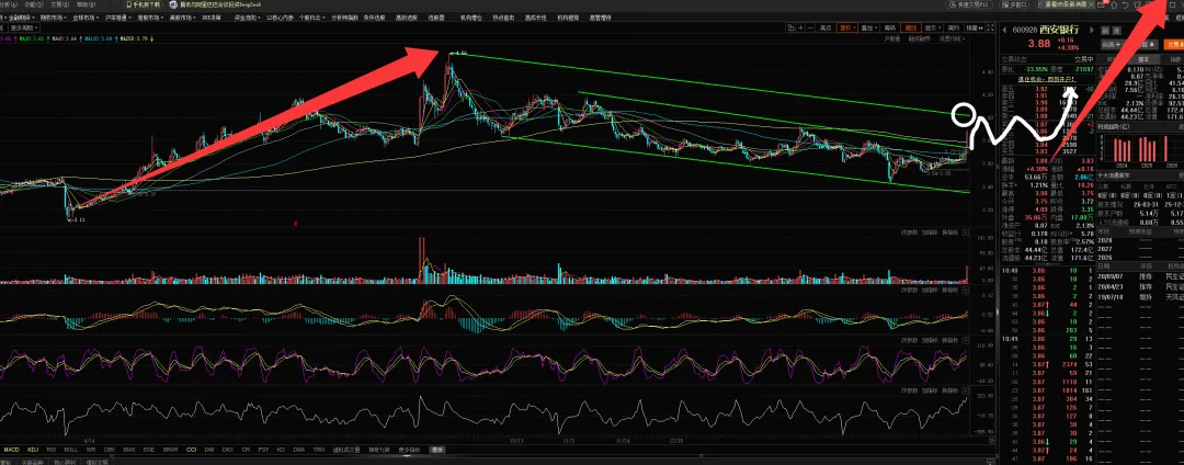 这是西安银行,我们用120分钟K线来看图,这次的下跌通道就是上图中的绿色通道,今天的中阳线,其实就是为了突破绿色下跌通道的中轨,随后就会碰到上轨压力,在那里,只要量跟不上,就会回撤,因此,想要做T的话,画出上轨压力线,盘中如果继续冲到那里,不妨就尝试着做一个小T,但是存在一定的踏空概率,因为现在的主力玩法都很狡猾,有时候会故意冲过压力一些再回撤,不一定会给技术派一个精准的减仓位,一旦卖错,短期踏空一下也是有可能,所以,要小心,最好的方法还是不动为好,只要周线MACD能维持住金叉了,那么,这波反弹应该是几周级别的走势,不用太早撤退的。如果成本比较低,中长线甚至还可以期待更大的行情,因为它的净资产已经到了8块钱,现在股价可才3块多,业绩又是明显的优秀,因此估值带来的安全边际还是比较高的。