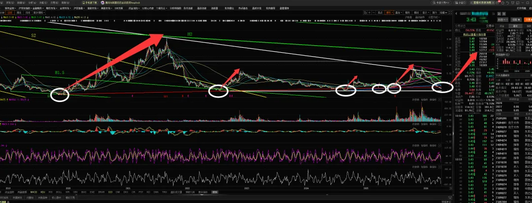 再来看今天继续维持弱势的HNJC,如果之前没有按要求做止盈出局的话,今天会是很煎熬的感觉了,如果之前在5块多破位的时候根据策略做过减仓了,那么今天已经看到了第六个买点,这也是六年以来的第六次买入机会。前边的五大买点几乎全部都是能吃到肉的,而且HNJC的买点其实都很好做,就是这个M1的支撑位,就是3.35-3.45区间,之所以是区间,因为中间有过破位,所以,要给出斜率宽容度,只要画对了线,就等着股价每次回落到这条红色的M1生命线时,大胆买进,买完就拿住,不赚钱不卖出,什么时候股价出现连续L5的上涨走势了,跌破趋势线就再卖出,连续几波行情都是比较容易吃下来的,怕的就是没买对位置的同时又没有做到高位及时兑现利润,这样来回坐山车会有一种痛不欲生的感觉。