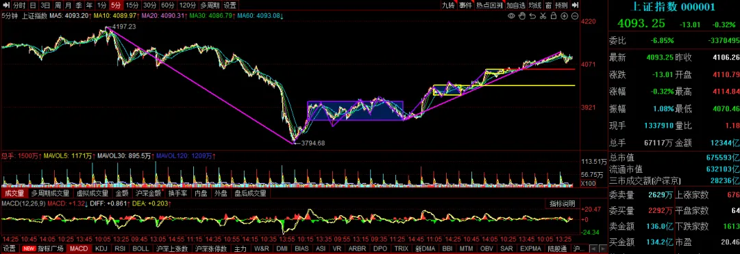 上证1分钟走势结构:上证1分钟上,一直在说这个地方有可能发生1分钟的调整。今天4096这个位置反弹,形成了第一次的反弹,不出新高。那么这个位置的结构可以先参考4050点附近中枢这一块,当然这次打出的低点是进入到了前面的中枢范围。因此无论后面形成一个1分钟的下,还是就这样就震荡上去了,形成新的1分钟上的开始。从结构生长来看,就是4100点附近中枢的一个延伸。不在这个中枢下方形成三卖的话,那么由于它跟前面4070点附近的中枢形成了重合,所以可以把它理解成这个地方可以变成一个扩张中枢。目前已是一个5分钟中枢,还是5分钟上升趋势,不破4000点大盘还是强势震荡。只要中线结构没有破坏,目前只看作调整,完全可以按我们现在的策略去实现,直到六月底七月初,再看,能不能走出来。所以这段时间如果演变成下上下的这个横盘结构的重心不能下移过大。所以带着结构的下,是没有问题的,像今天的这个下,实际上是带着结构的。什么叫带着结构?就是它有上下的折腾,下来看似很猛,但很快又被拉起来,再折腾,这就是来回的上下上下舞动。没有抵抗的下跌,是不允许的。只要是在盘中的运动有抵抗的,而且空间是不大的,那就是一个良性的。只要在4050上方能运动的话,那就属于非常强的调整了。在目前还算有共识下的上涨,一般的调整不会超过两天,也就是说明天再调整一下,周一可能迎来一些阳线的特征了。宏观层面,短期看货币政策