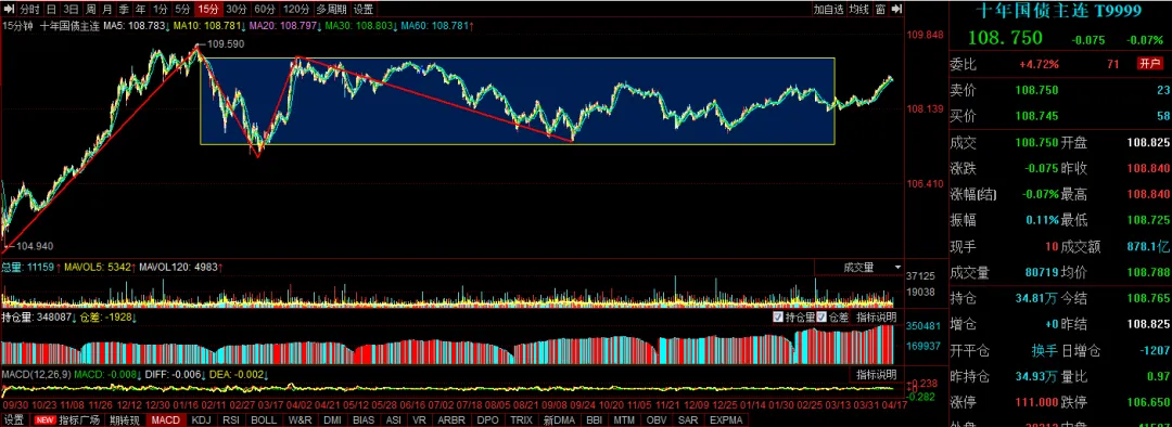 上图是十年期国债期货的15分钟K线走势图,目前15分钟是下跌一笔。1分钟上涨笔,目前股债的策略应该是债横盘,股票市场趋势向上。