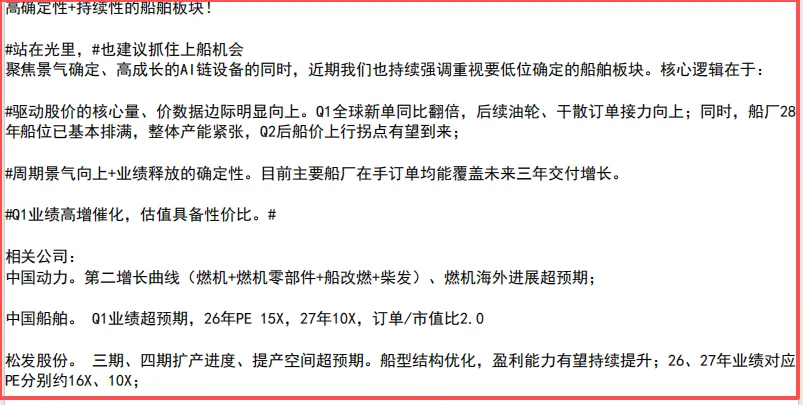 最后单独讲一个板块——船舶制造,这个方向可以和燃气轮机结合起来看,逻辑更硬。中船最近签订了170亿的大订单,而且造船周期还在往上走,景气度没问题;而给船舶提供动力的就是如下图,机构那边已经看到1400亿市值,大家可以多留意。
