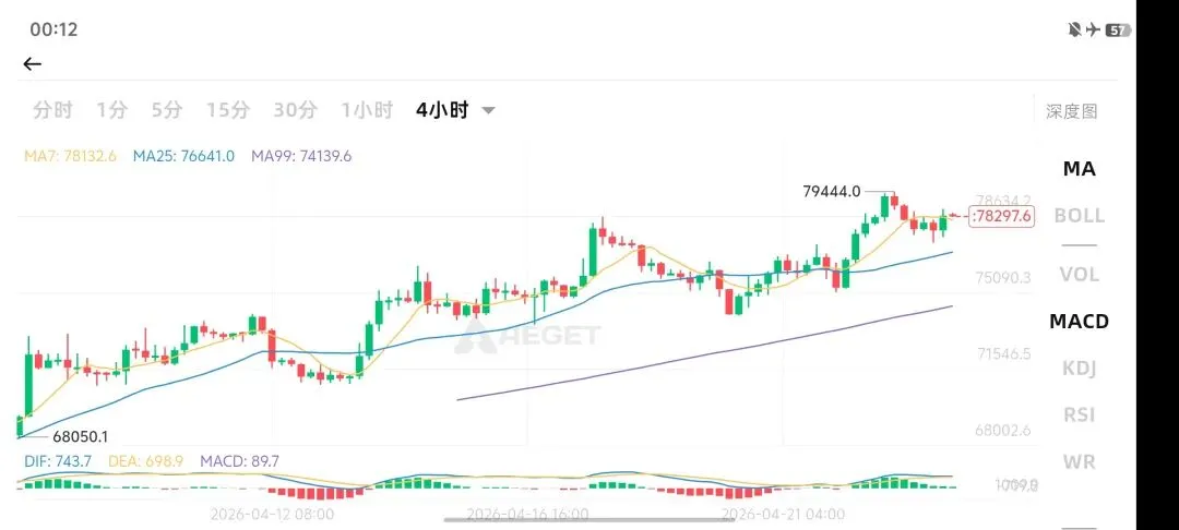 比特币在4月22日从76,133美元的低点强势拉升至79,415美元(近两周高点),随后冲高回落,目前在78,300美元一线陷入区间震荡格局。4月24日市场面临美伊停火决议落地的关键节点,方向选择迫在眉睫。