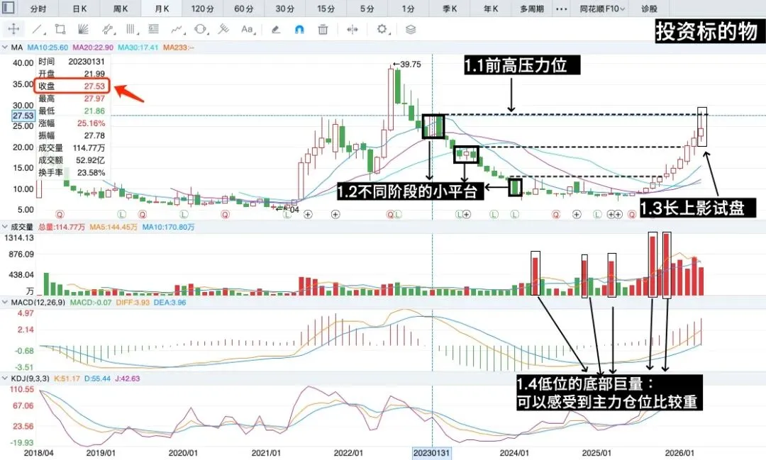 当底部连续放巨量的时候,可以判断主力的仓位较大,如图1中的“1.4”所述。【图2_盛屯矿业_月线图】