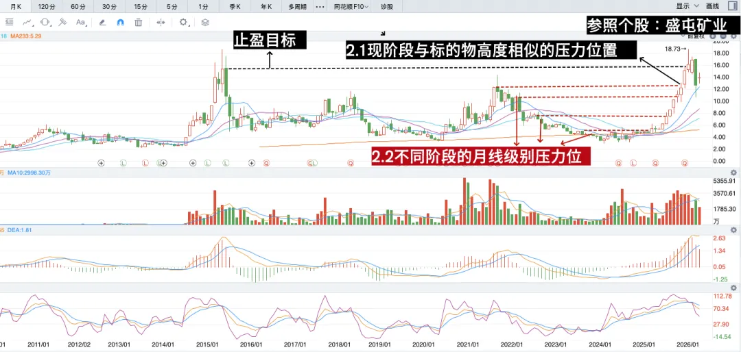 【图2】的“2.1”处,参照个股的这个位置,也就是前高处出现了上影线,而图中的【止盈目标】也是盛屯矿业的历史最高价,“2.1”处比较接近历史最高价。