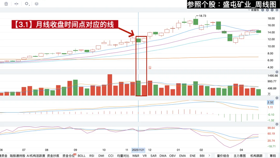 【图3_盛屯矿业_周线图】中的【3.1】处(2026/11/21~2026/11/28),对应的是【图2_盛屯矿业_月线图】中的【2.1】那根月线(2026/11/28)收盘的时间节点附近。