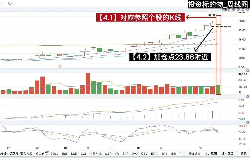 其实在4月23日的时候,我看了一眼,我决定加仓的位置是23.55元,因为从日线级别看,我设置的加仓位置是日线图的20日均线(一会儿给大家展示日K走势),今天价格最低达到了23.80元,离我的理想价位差着2.5毛钱/股,所以我没有进行加仓;另外一个原因是今天(4月23日)是周四,需要到周五才能走出一根完整的周K,所以在二者原因的加持下,我决定等周五看看什么情况,我个人认为只要在5月1日前进场就可以了。