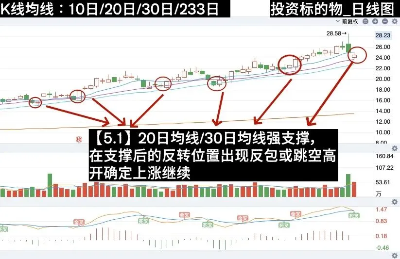 如果你想再保险一点,你再继续看,你会发现当价格出发20日或30日均线的支撑位即将反转的时候,会出现阳线实体反包阴线的动作,或者是跳空高开,那么你也可以在反包的时候或者跳空高开的时候去进场买入或加仓。
