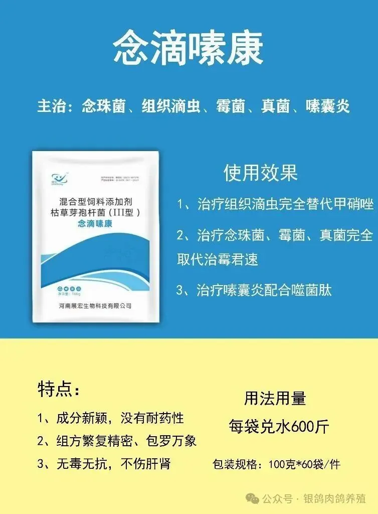 【念滴嗉康】主治:鸽子毛滴虫感染引起的口黄,乳鸽嗉囊肿胀不消化,口腔有白点,滋生的白色假膜(念珠菌感染),引起乳鸽消瘦、长势差,残次品多,达标率低!客户反馈乳鸽用后涨势很好,次品鸽明显减少念滴嗉康:针对毛滴虫、念珠菌、霉菌、嗉囊炎