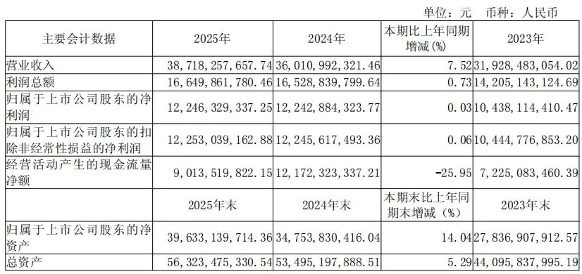 4月22 日,汾酒发布2025年年度报告,2025年实现营收387.18亿元,同比增长7.52%;归属于上市公司股东的净利润122.46亿元,同比增长0.03%。