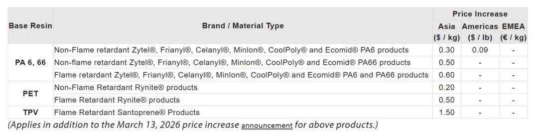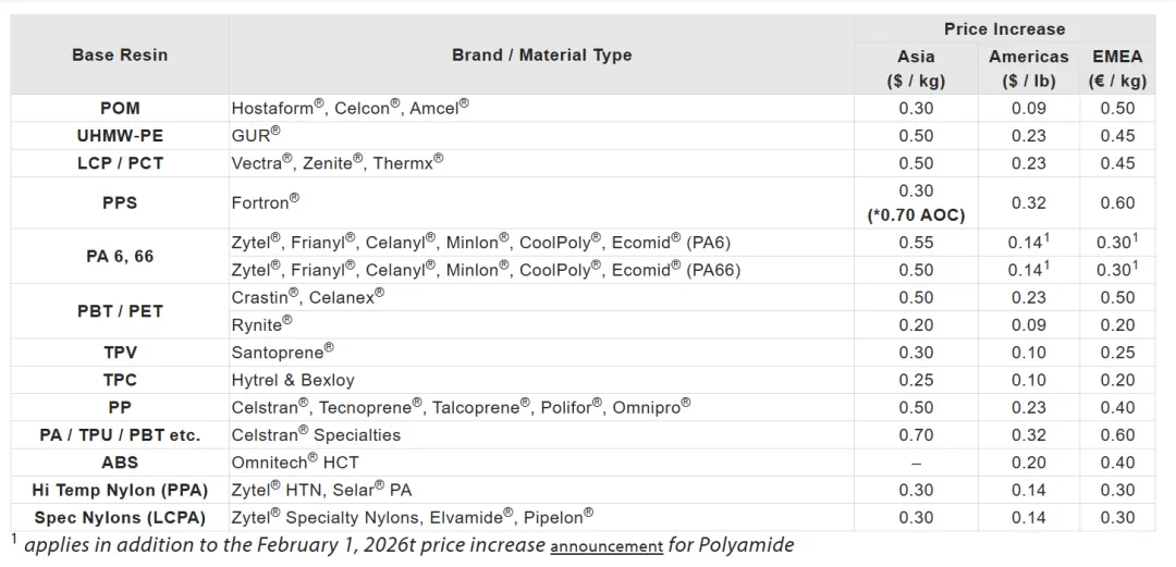 此外,2026年4月17日,塞拉尼斯公司宣布,受近期市场发展和全球供应链中断等多种因素影响,公司将上调一系列工程塑料产品的价格,其中亚洲地区: