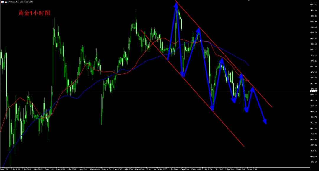 黄金4小时开始高位逐步构筑顶部结构,黄金1小时整体还是在下行通道中运行,整体黄金还是震荡偏弱的下行结构,因为最近消息面变化比较快,所以黄金的行情经常就是上跳下窜的大起大落的走势,不过情绪化的行情一般都不持续,尤其是是像现在利多利空的消息循环往复的交织,早盘黄金继续关注4720-4730区域的阻力继续高空为主。