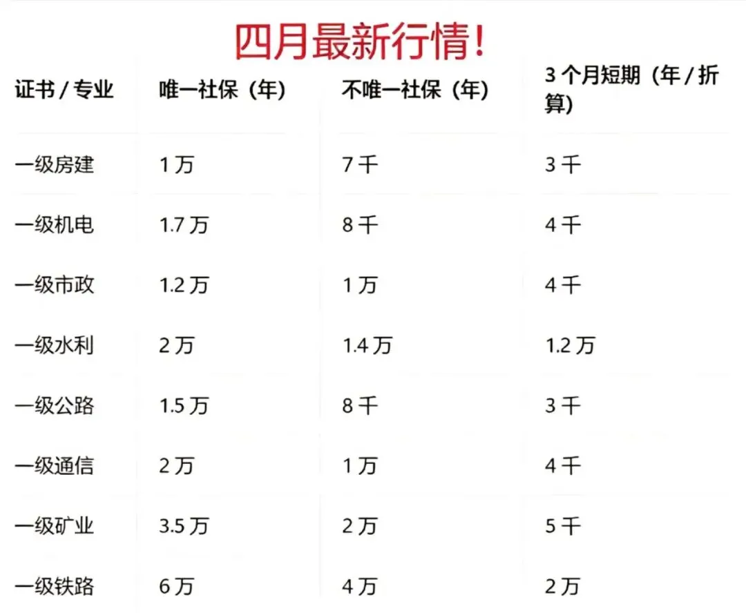 第三梯队是低价饱和省份,集中在西北、东北的部分省份。当地基建项目少、企业资质需求有限,同时历年持证人数大量溢出,市场严重供大于求。行情直接被压到最低,多数专业年收入不足2万元,部分冷门专业甚至出现“有证无人要”的窘迫情况。