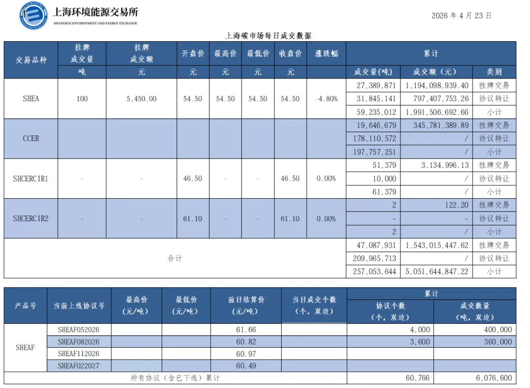 截至今日,上海碳市场所有现货品种累计成交量257,053,644吨,累计成交金额5,051,644,847.22元。其中,配额累计成交59,235,012吨,成交金额1,991,506,692.66元;CCER累计成交197,757,251吨;SHCERCIR1累计成交61,379吨;SHCERCIR2累计成交2吨。上海碳配额远期产品累计成交数量6,076,600吨。